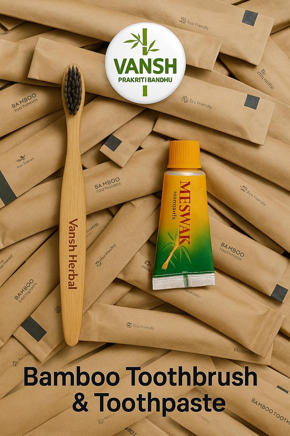 - Eco‑friendly & Sustainable: Made from 100% biodegradable bamboo—good for your smile and the planet. Complete On-the-Go Kit: One bamboo toothbrush + Meswak toothpaste packaged in each box—perfect for travel or hospitality use. Hygienic & Convenient: Individually wrapped for cleanliness—especially ideal for hotel guests. Bulk Value Set: 100 kits in one box, designed for businesses, guest amenities, medical setups, or giveaways. Natural Clean, Refreshing Taste: Meswak-infused toothpaste promotes oral health with herbal freshness.